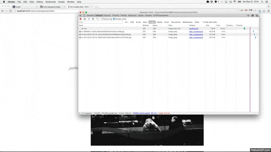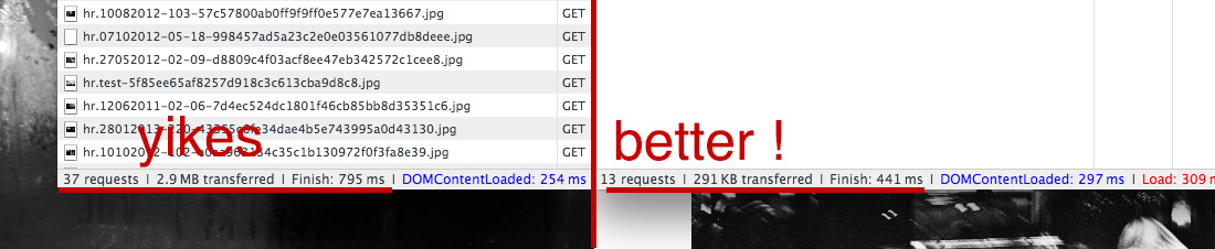 My initial implementation however relied on data-uri to show a placeholder image as the real picture loaded. That turned out to be a bad idea, as they’re not cacheable, they’re quite heavy (2.5k each time) and add quite a bit of HTTP overhead. After looking around I decided to swap them for an inline SVG which weighs 650B, is downloaded only once and is cached by the browser.
